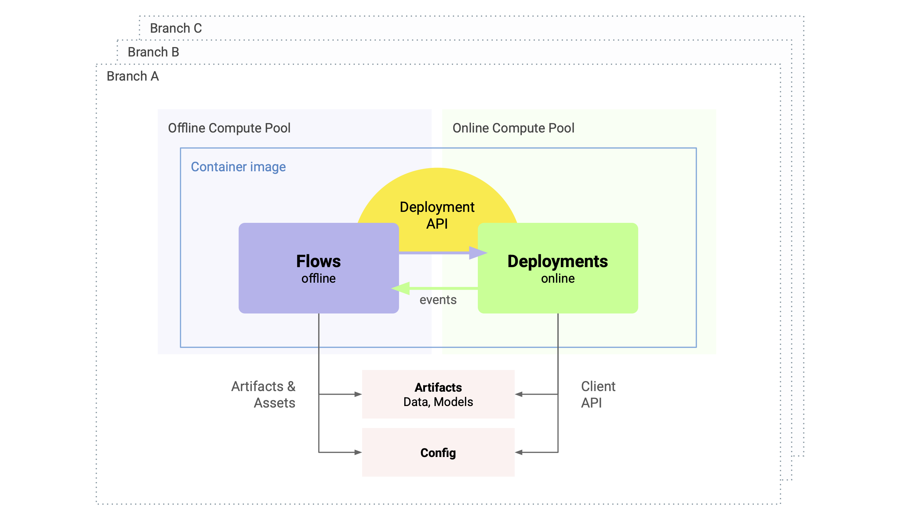 - Flows (the purple box) are used to build and prepare assets - models, data, and metadata - in the background. Flows can encapsulate any offline processing, such as model training, data processing, or deep research agents.