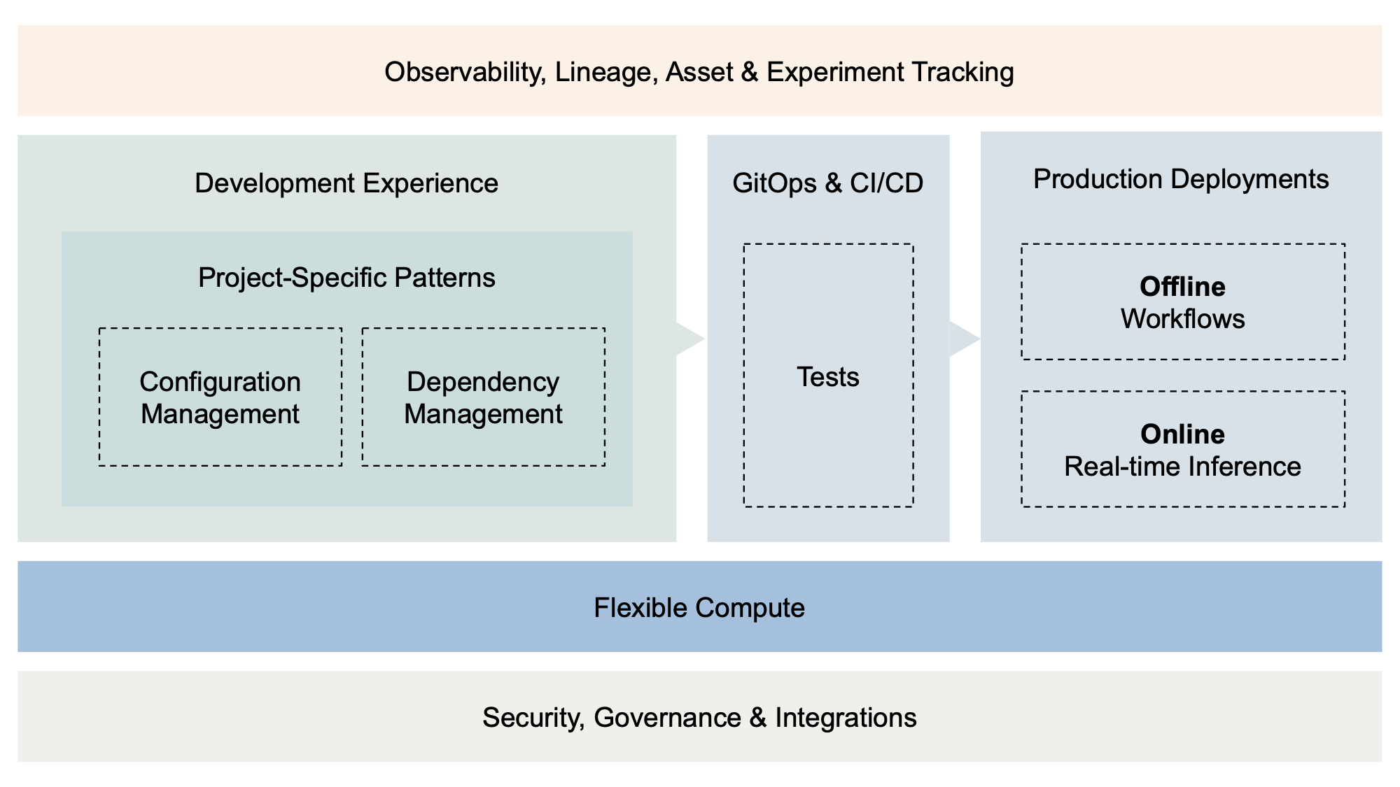 So what falls outside the scope of substantial frameworks like PyTorch? Critically, the questions of how you develop, deploy, and operate systems that rely on compositions of these libraries. Addressing these concerns effectively requires components that lie beyond the frameworks themselves — the realm of Metaflow and Outerbounds — as illustrated in the diagram below: